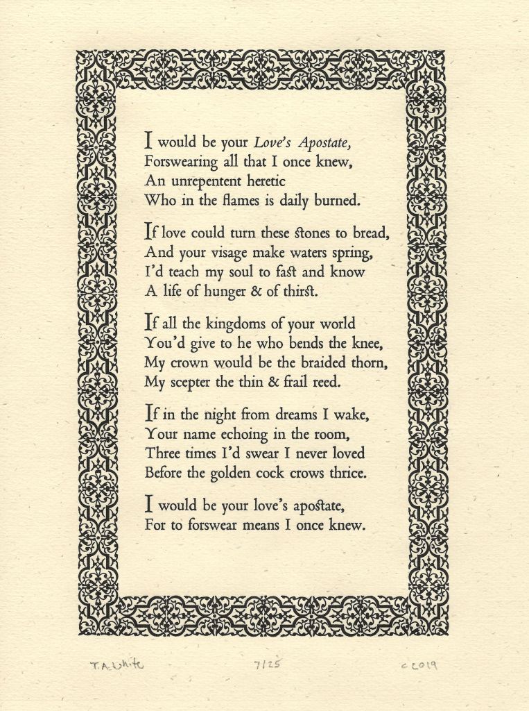 WHAT I LIKE ABOUT THIS PRINT … Uffa. What do I say? The paper is laid Gutenberg, and if you were to hold it up to the light you can see the chain lines from the mold, which are characteristic of early hand-made paper. The type is a facsimile (exact copy) from Aldus Manutius’ Hypnerotomachia Poliphili, published in Venice in 1495, and known as the most famous book no one has ever read. Wm. Morris, the impresario of the Arts & Crafts movement, considered it the most beautiful book ever printed. Its publication is seen as the moment the monochromatic printed book freed itself from the medieval manuscript. The border was recreated by me from Hadrianus Juniuis’ Emblemata, published by Christophe Plantin in Antwerp in 1565. I shared the text with an English Professor once and was quite pleased when he later confessed he had done a Google search since he assumed I could not have written it. Honestly, folks, who hasn’t wanted to say out loud “three times I’d swear I never loved/before the golden cock crows thrice”?
